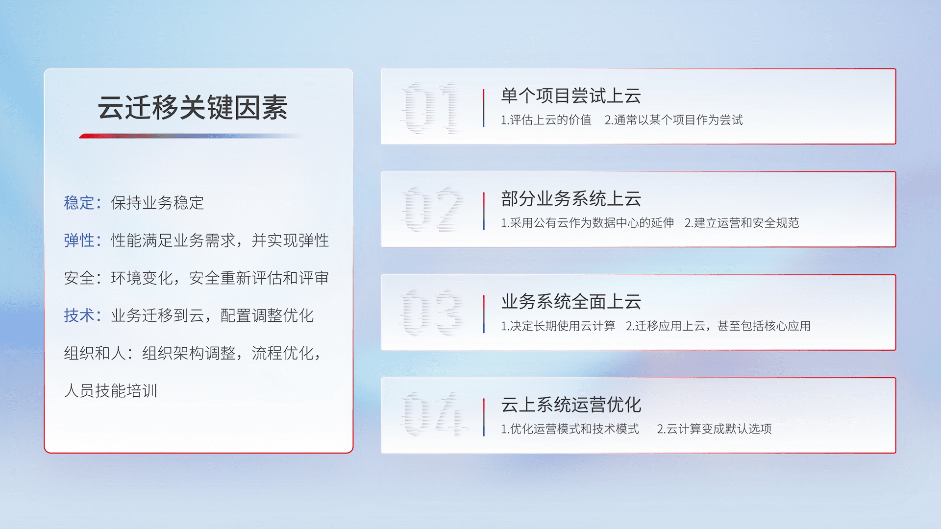 结合实际业务,,,,从规划设计、、云平台选型、、、、云原生改造、、数据迁移、、、、集成交付,,,迁移全过程为客户识别最佳上云路径,,,做好风险识别管理,,设计网络架构、、、身份权限、、、、安全审计合规、、操作审计、、、日志审计、、、监控告警策略、、、、多站点容灾设计等,,,,对云上基础设施进行整体规划,,,,提升IT治理水平,,以满足弹性、、高可用、、、高性能的需求。。
